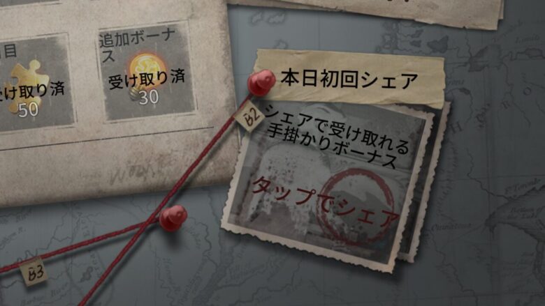 1日1回ゲーム画面をシェアすると手掛かり20個を入手できる。
