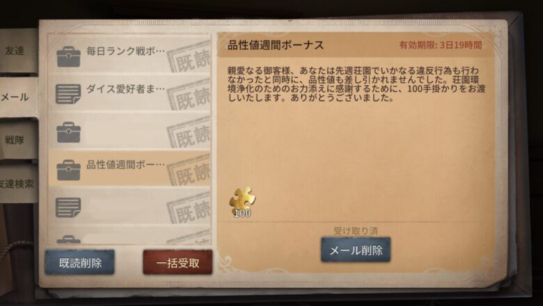 毎週木曜日のメンテナンス後に200個、1週間品質値が下がらなかった場合毎週月曜日に100個のピースが手に入る。