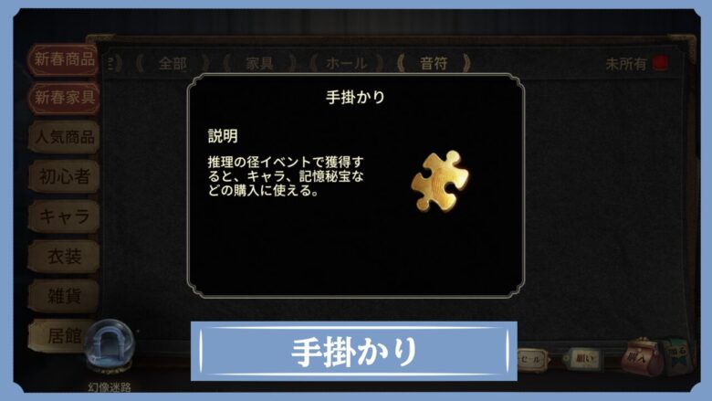 ショップで手掛かりを消費して居館の内装や家具を購入できる。