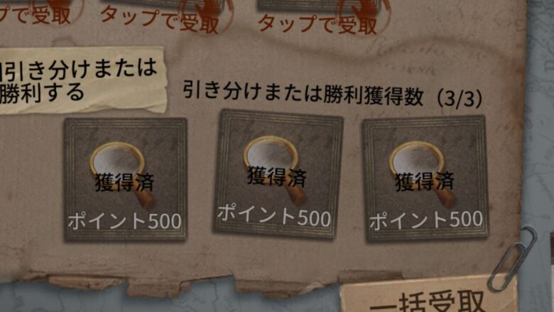 毎日初めの3勝(引き分けでも可)は追加で500点の推理点数を獲得できる。