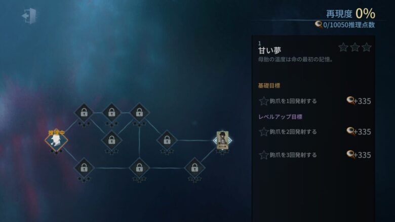 解放済みのキャラには背景推理があり、対戦でミッションをクリアすると追加で最大1005点の推理点数を獲得できる。