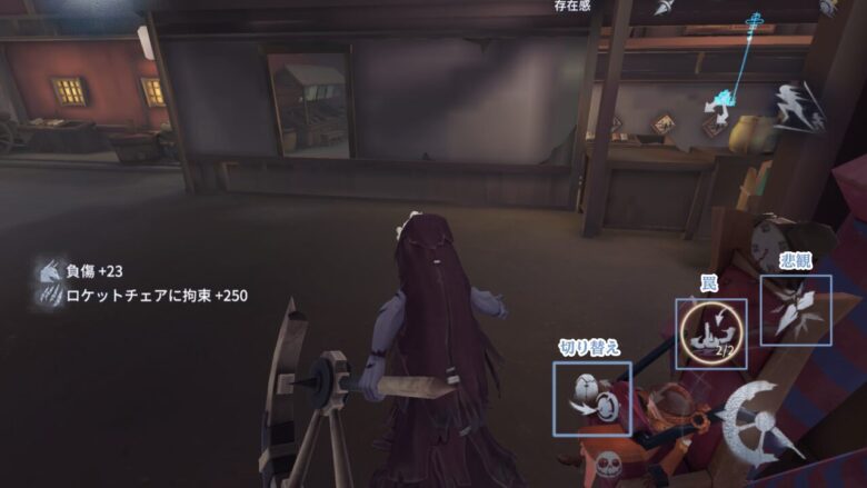 存在感が2段階溜まると、車輪から人間形態に切り替えた時半径10m以内の全サバイバーに突刺を1本付与する。