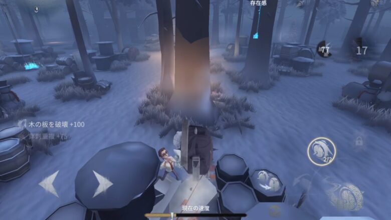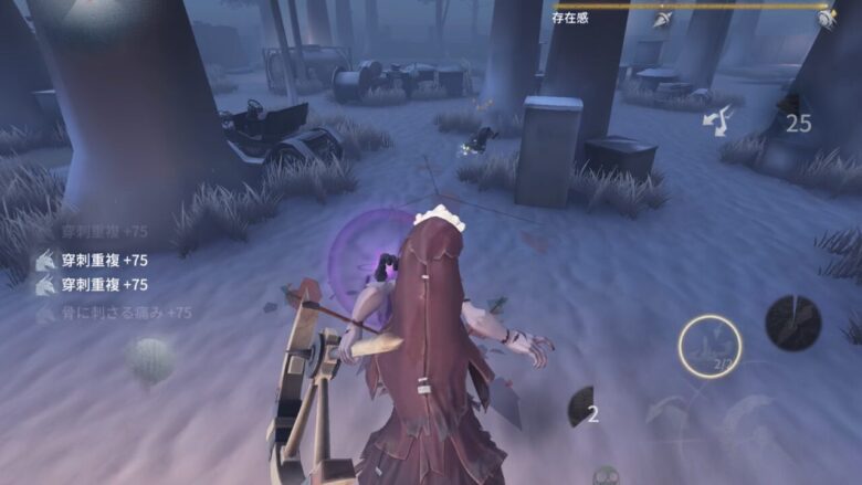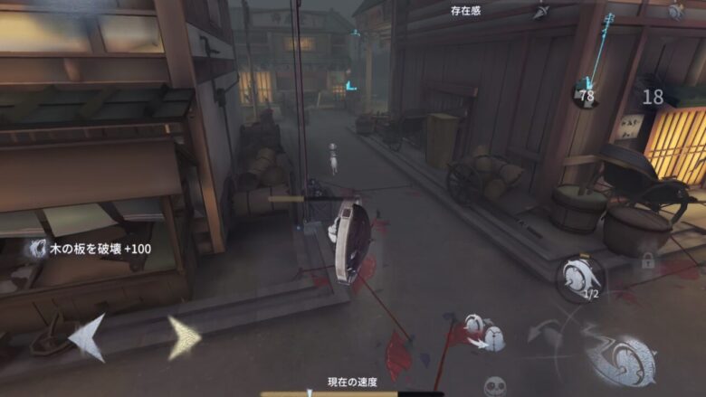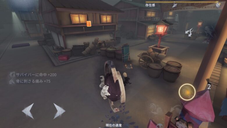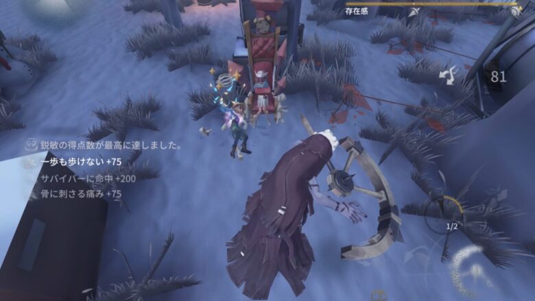 中間でサバイバーを見つけてトゲを刺そう。早めに見つけて2本付与できれば救助狩りができる。存在感がMaxの場合は1本付与で可能。